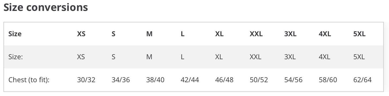 Chest (to fit) 34/36 38 40/42 44/46 48/50 52 54/56 58/60